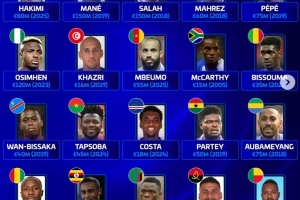 24直播网讯 德国转会市场盘点非洲球员历史身价,萨拉赫与马内以1.5亿欧并列榜首。奥斯梅恩(1.2亿欧)次之,阿什拉夫(8000万欧)位列第三。该榜单涵盖了非洲各国球员的最高身价纪录。