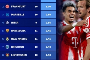 24直播网讯 德转盘点了本赛季五大联赛场均进球榜,拜仁以11场场均3.64球高居榜首。法兰克福、马赛分列二、三位,国米、巴萨、皇马、布莱顿等队也进入前十。