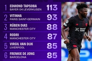 24直播网讯 欧冠首轮战罢,勒沃库森后卫塔普索巴以113次传球、93%的准确率,成为本轮传球王。他也是唯一传球次数超过100次的球员,其出色表现帮助球队在欧冠赛场展现了强大的控球能力。