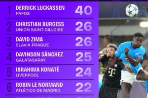 24直播网讯 欧冠联赛前三轮战罢,Squawka统计的解围榜出炉。帕福斯后卫卢卡森以40次解围断崖式领跑,圣吉罗斯的布尔格斯与布拉格斯拉维亚的齐玛以26次并列第二。热刺的桑切斯(25次)和利物浦的科纳特(24次)分列三四位。
