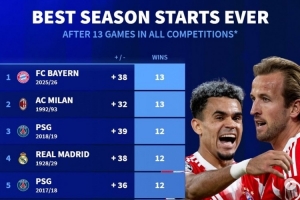 24直播网讯 拜仁德甲3-0完胜门兴,豪取赛季各项赛事13连胜,追平米兰纪录,成为五大联赛单赛季前13场最佳开局。德转统计显示,拜仁2025/26赛季以13胜、+38净胜球位列历史第一,AC米兰(92/93赛季)以13胜、+32净胜球紧随其后。
