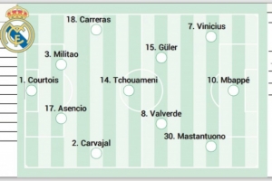 24直播网讯 皇马因赫伊森停赛、阿诺德伤缺,被迫调整防线:卡瓦哈尔顶替右路,阿森西奥客串中卫。锋线上,维尼修斯首发,贝林厄姆与卡马文加将替补登场。库尔图瓦镇守球门,姆巴佩领衔锋线,皇马迎来变阵挑战。