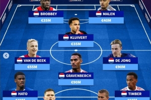 24直播网讯 《转会市场》统计了阿贾克斯现役青训球员的巅峰身价,并排出最贵阵。该阵总身价高达5.72亿欧元,赫拉芬贝赫和德容领衔中场,两人均为9000万欧元;德里赫特(7500万)和廷伯(6000万)坐镇后防,布罗比和马伦组成锋线。