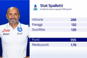 数据统计显示,斯帕莱蒂共计在意甲取得288胜、132平、139负,总积分996分、场均积分1.78分。