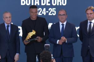 24直播网讯 姆巴佩在伯纳乌正式领取其生涯首座欧洲金靴奖,成为皇马队史第三位获此殊荣的球员。尽管以31球荣膺金靴,但他在积分榜上险胜约克雷斯和萨拉赫。
