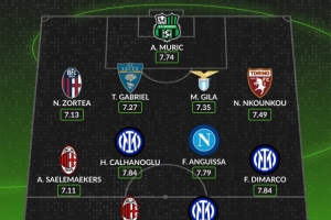 24直播网讯 WhoScored公布了意甲10月最佳阵容。门将为穆里奇(萨索洛)。后卫线由佐尔泰亚、蒂亚戈-加布里埃尔、吉拉和恩库恩库组成。中场包括萨勒马科尔斯、恰尔汗奥卢、安古伊萨和迪马尔科。前锋则是莱奥与博尼。国米与米兰球员共有5人入选。