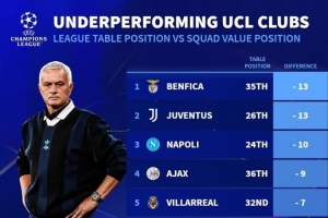 24直播网讯 德国转会市场评出欧冠表现不佳球队,本菲卡、尤文最差,排名比身价低13位。那不勒斯、阿贾克斯等队也因排名远低于身价上榜,皇马、切尔西等豪门亦在列,凸显球队表现与阵容价值不符。