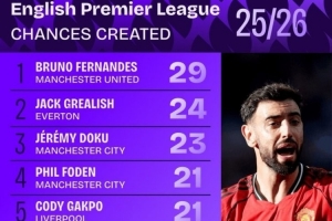 本赛季英超创造机会排行榜:B费力超越格拉利什排名第一,曼城与利物浦均有两人上榜。