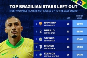 24直播网讯 德国转会市场公布了未入选巴西队本期名单球员的身价榜。巴萨前锋拉菲尼亚以9000万欧身价高居榜首。诺丁汉森林的穆里略(5500万欧)和曼城的萨维尼奥(5000万欧)分列二、三位,尤文图斯的布雷默同样价值5000万欧。该榜单统计了所有未入选球员(含伤缺)的当前市场价值。