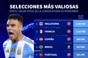 24直播网讯 德国转会市场公布11月国家队身价榜,英格兰以13.3亿欧居首,法国(12.3亿欧)、西班牙(9.89亿欧)分列二、三位。阿根廷仅排第九,身价5.4亿欧。巴西、葡萄牙、荷兰、意大利、德国紧随其后。