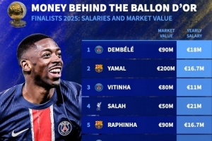 24直播网讯 德国转会市场盘点了2025年金球奖前10球员的年薪。姆巴佩以3130万欧年薪居首,登贝莱为1800万欧。萨拉赫以2100万欧排名第四,而帕尔默年薪最低,为680万欧。