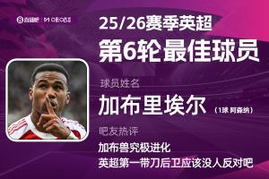 24直播网讯 英超第六轮最佳球员评选结果出炉。阿森纳后卫加布里埃尔凭借补时头球绝杀,帮助球队2-1战胜纽卡斯尔。他凭借这一关键表现,获得8万吧友支持,力压哈兰德当选。