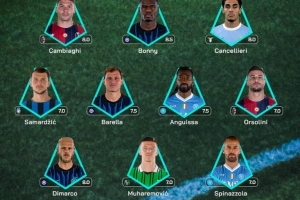 24直播网讯 意甲官方公布第6轮最佳阵容,国米三人入选。门将为AC米兰的迈尼昂,后防由迪马尔科领衔,中场包括巴雷拉、安古伊萨等,前锋则有坎比亚吉、博尼和坎塞利耶里。