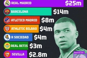 24直播网讯 根据Sponsorlytix统计,西甲球队衣袖广告收入榜单出炉。皇马以2500万美元高居榜首,巴萨以1400万美元位列第二。马竞、毕尔巴鄂竞技、皇家社会等紧随其后,展现了豪门在商业开发上的绝对优势。